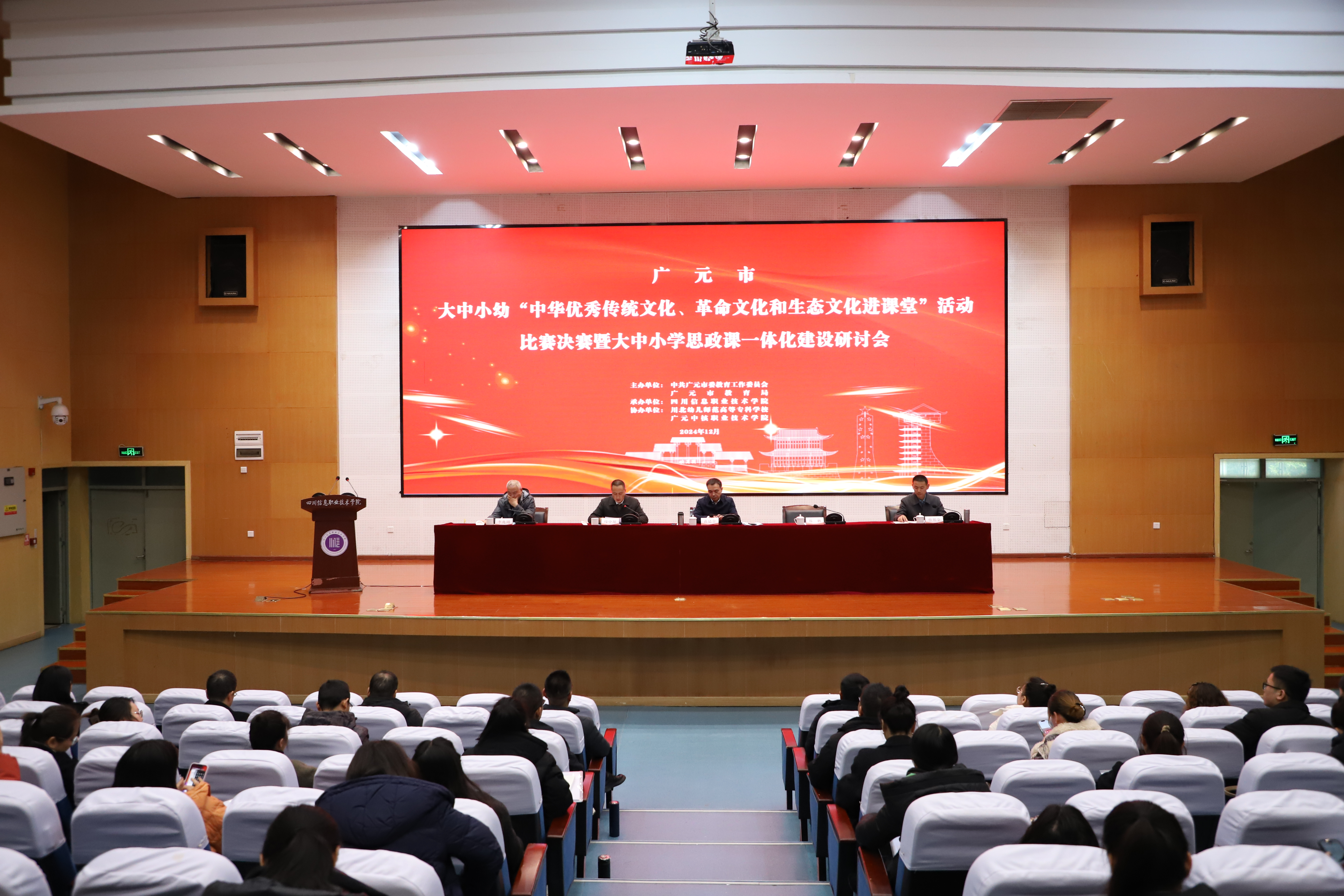 2024年12月13日,由中共广元市委教育工作委员会、广元市教育局主办,四川信息职业技术学院承办的“广元市2024年大中小幼‘中华优秀传统文化、革命文化和生态文化进课堂’比赛决赛暨大中小学思政课一体化建设研讨会”在四川信息职业技术学院顺利召开。市委教育工委书记、市教育局党组书记黄廷全,学院党委副书记、院长韩鹏,党委委员、副院长母中旭,市教育局党组成员、副局长蔡邦金及全市80余所大中小学校110余名思政课教师参加了本次会议。会议由学院党委委员、副院长母中旭主持。